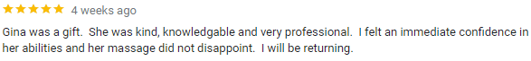 Gina: Tuesday & Thursday 30, 60, or 90 min massages – call the office to schedule